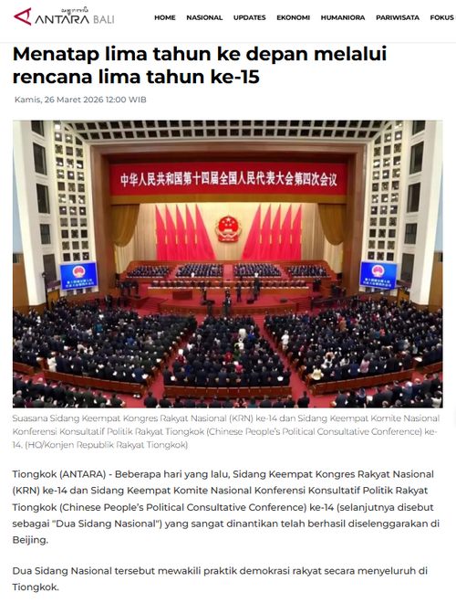 2026年3月26日,驻登巴萨总领事张志昇在领区三省印尼文主流媒体《巴厘邮报》《西努沙登加拉之声》《古邦邮报》和印度尼西亚安塔拉通讯社网站发表署名文章《从“十五五”规划纲要展望未来五年的中国》,宣介全国“两会”精神和“十五五”规划。全文如下: